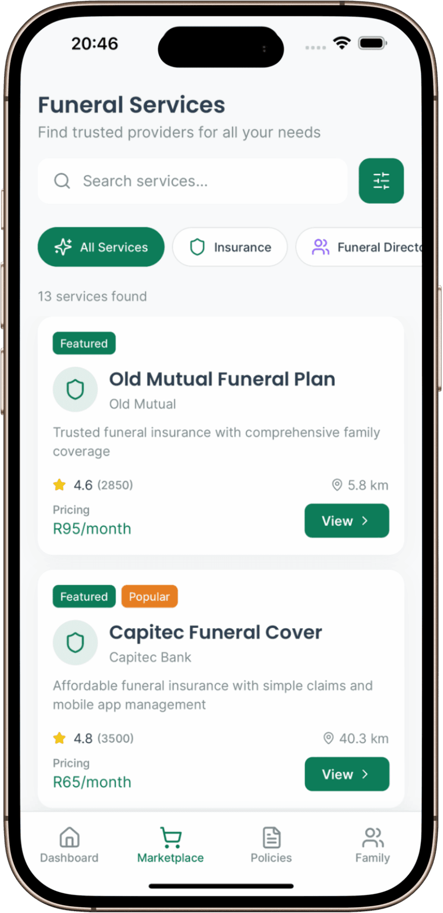 Browse funeral insurance policies and services from multiple providers in one place. Compare coverage amounts, premiums, and ratings. Read reviews from other users. Find the best policy for your family's needs and budget. Connect with funeral parlours and service providers.