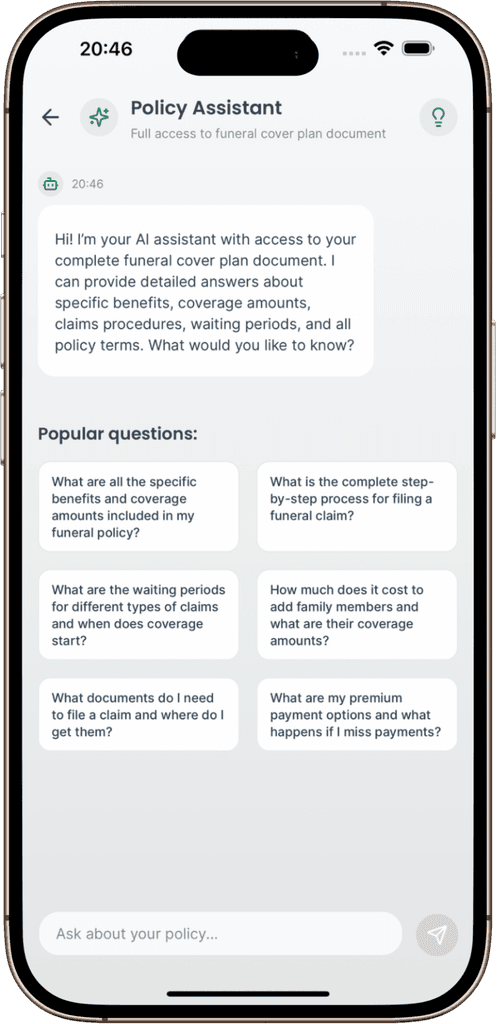 Ask questions about your funeral insurance policies in plain language and get instant answers. Understand your coverage, compare policies, check claim requirements, and get personalized recommendations. Available 24/7 to help you make informed decisions about your funeral insurance.